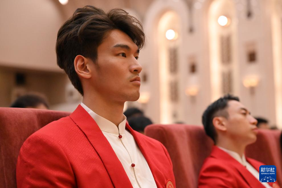 8月20日,射擊運(yùn)動(dòng)員盛李豪、游泳運(yùn)動(dòng)員潘展樂(lè)、乒乓球運(yùn)動(dòng)員馬龍、網(wǎng)球運(yùn)動(dòng)員鄭欽文(前排,從左至右)在總結(jié)大會(huì)上。