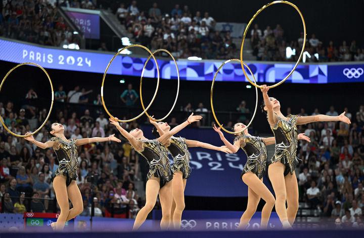 中國隊在巴黎奧運(yùn)會藝術(shù)體操集體全能決賽中(2024年8月10日攝)。新華社記者 程敏 攝