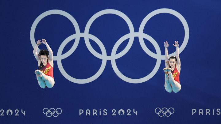 冠軍中國選手昌雅妮(右)/陳藝文在巴黎奧運(yùn)會跳水女子雙人3米板決賽中(2024年7月27日攝)。新華社記者 李明 攝