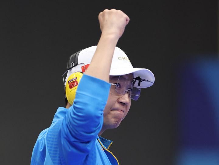 中國選手李越宏在巴黎奧運(yùn)會射擊男子25米手槍速射決賽中打出最后一槍后慶祝奪冠(2024年8月5日攝)。新華社記者 張帆 攝