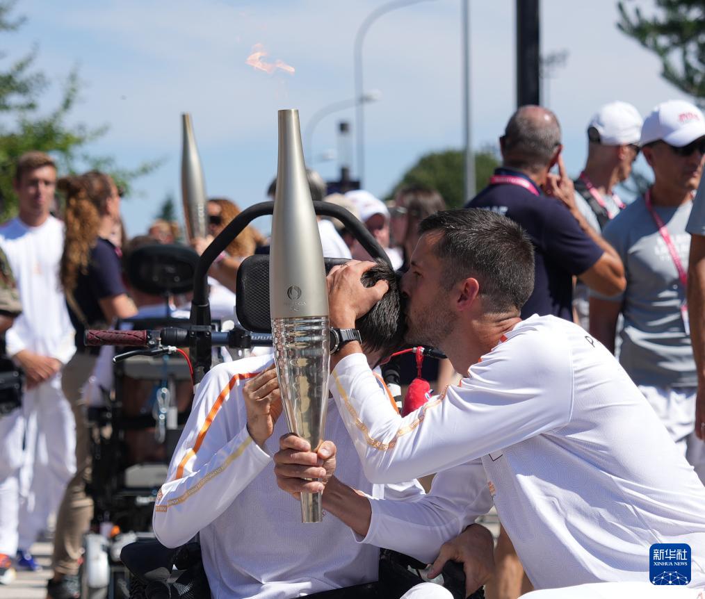 8月27日,火炬手瓦倫丁·弗蘭卡維拉(前右)在火炬?zhèn)鬟f中親吻他的兄弟泰奧菲勒·弗蘭卡維拉。新華社記者 賀燦鈴 攝