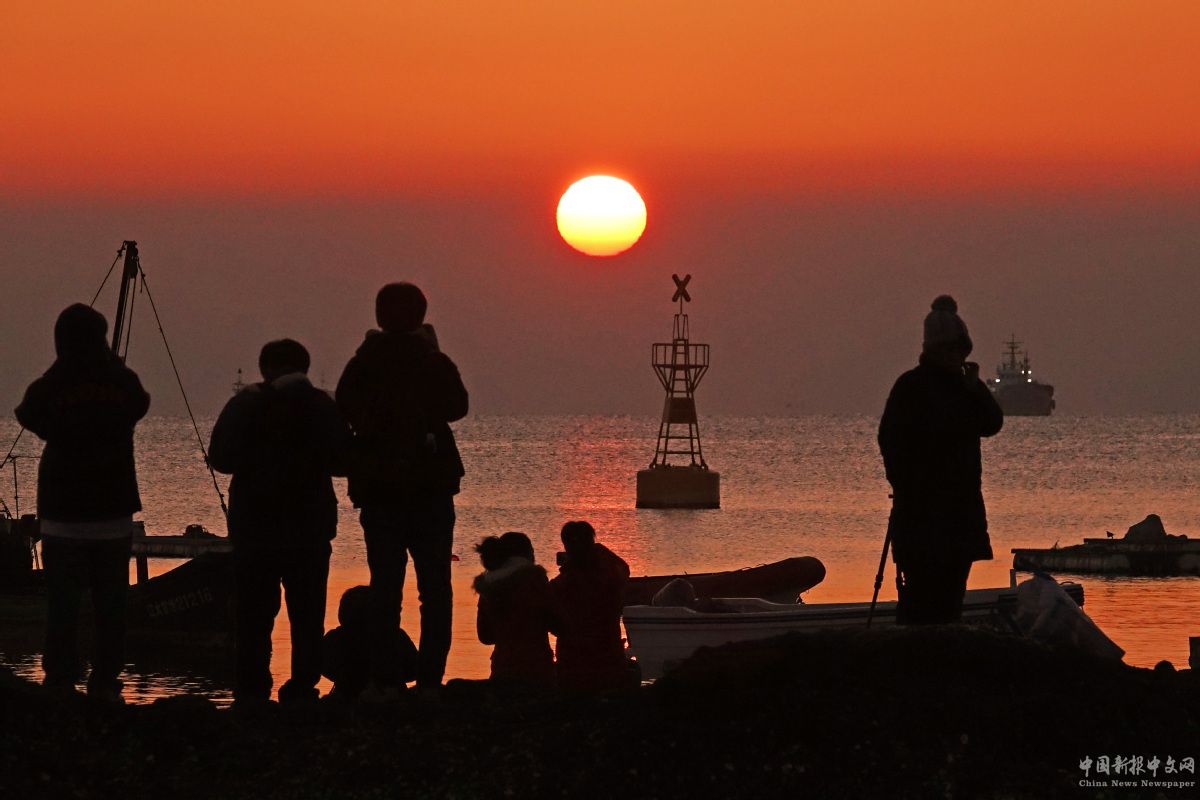 1月1日,山東省青島市嶗山區(qū)石老人海邊,游客觀看海上日出。王海濱 攝