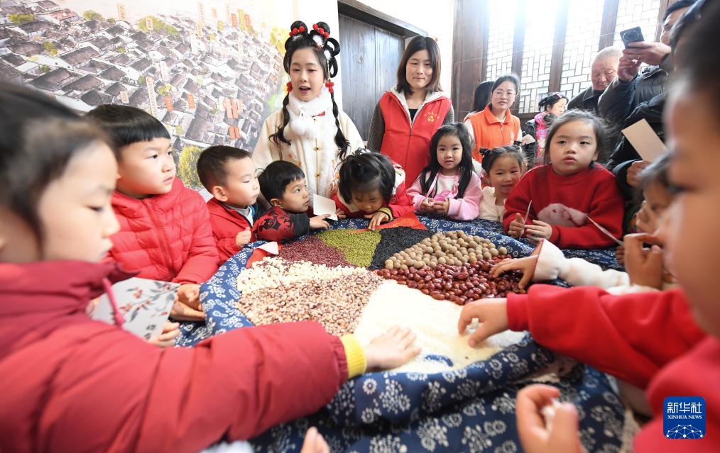 1月13日,湖州市實(shí)驗(yàn)幼兒園的老師帶著學(xué)生在小西街的民俗展示廳認(rèn)識臘八粥的原料。