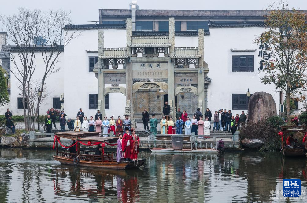 1月18日,中外青年身著傳統(tǒng)服飾在建德嚴州古城的船上體驗傳統(tǒng)水上婚禮習(xí)俗,包括出閣、梳妝、登船、親迎、禮拜等多個環(huán)節(jié)。
