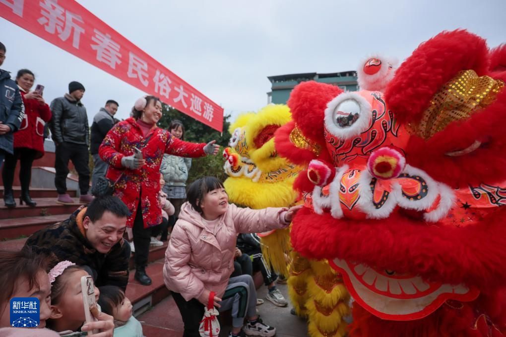 2月5日,在四川省遂寧市蓬溪縣蓬南鎮(zhèn)新春民俗大巡游活動(dòng)現(xiàn)場(chǎng),民間藝人表演舞獅并與小朋友互動(dòng)。