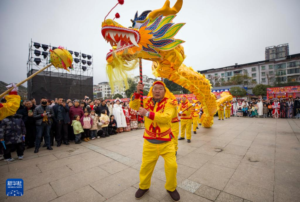 2月5日,人們?cè)谫F州省綏陽(yáng)縣舞龍迎接龍年春節(jié)的到來(lái)。