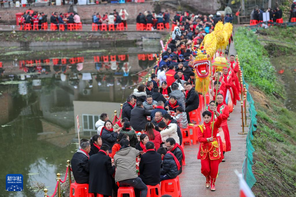 2月5日,在四川省宜賓市南溪區(qū)裴石鎮(zhèn)文化社區(qū),村民一邊吃團(tuán)年飯,一邊觀看舞龍表演。