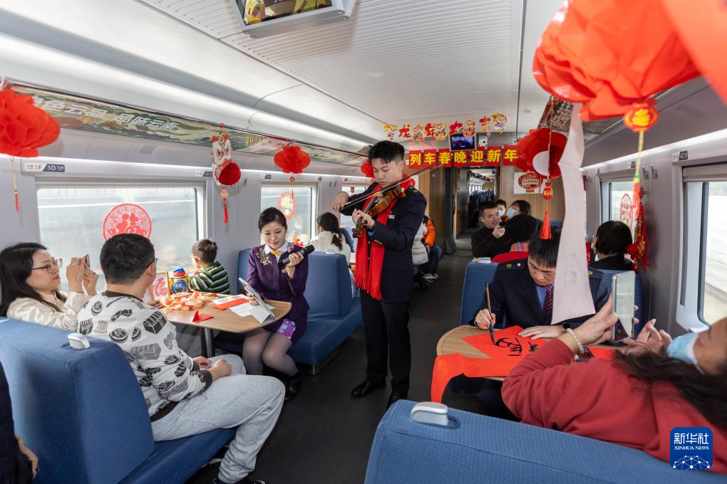 2月9日,在鐵路上??瓦\段G1426次列車舉行的“列車春晚迎新年”主題活動上,乘務員為旅客演奏小提琴。