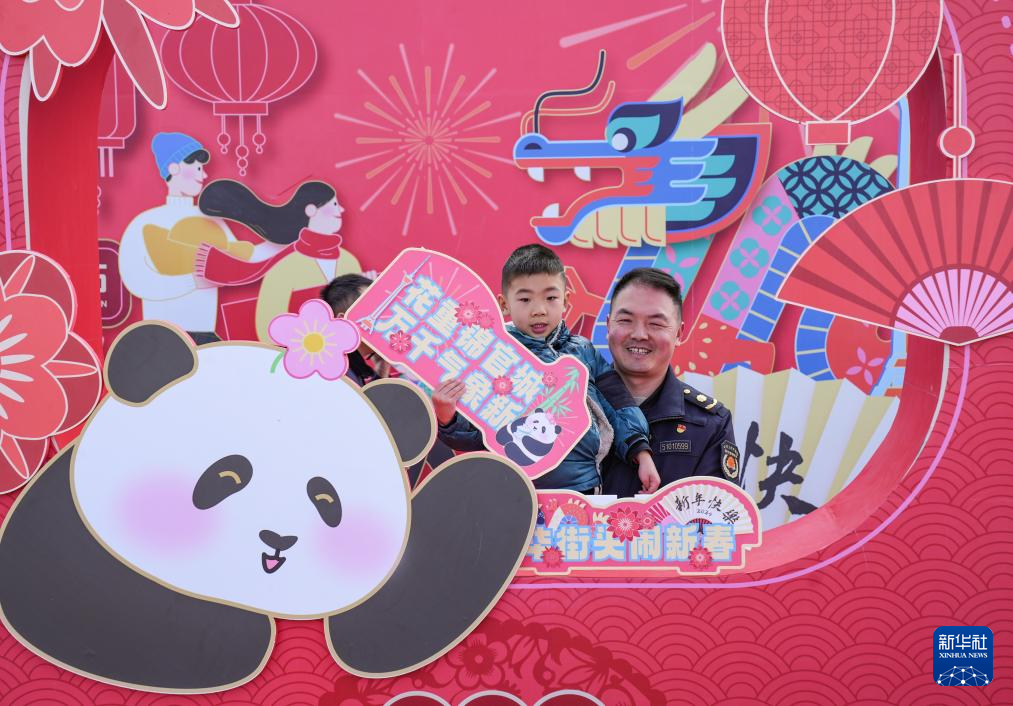 2月9日,在四川省成都市,旅客在成都東站西廣場的新年主題裝飾處留影。