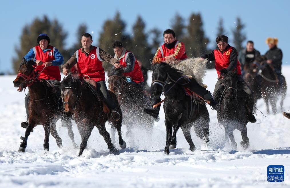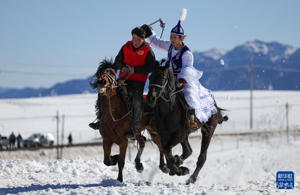 農(nóng)歷大年初二,新疆烏魯木齊縣“春節(jié)八天樂”系列活動(dòng)——傳統(tǒng)體育民俗鬧新春在甘溝鄉(xiāng)進(jìn)行。村民們?cè)诒└采w的烏拉斯臺(tái)草原上進(jìn)行雪地賽馬、“姑娘追”、馬上拾銀、叼羊等比賽,歡度新春。