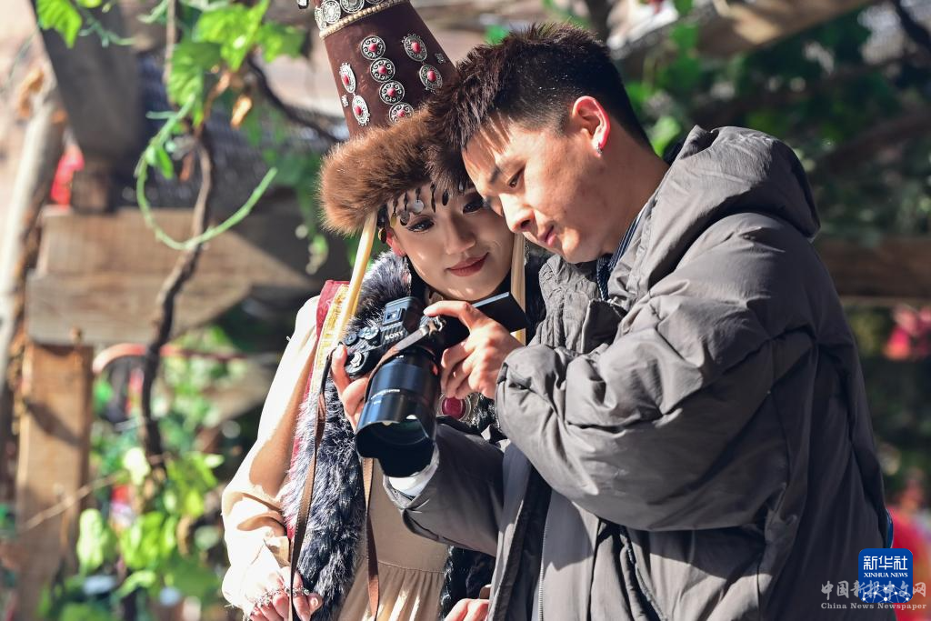 2月15日,旅拍游客在新疆烏魯木齊大巴扎步行街拍攝寫真。