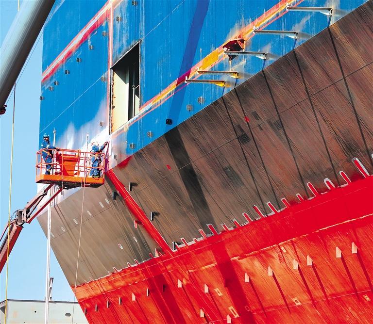 2月17日,山東煙臺中集來福士海洋工程有限公司,員工在一艘大型船舶建造現(xiàn)場作業(yè)。唐 克攝(中經(jīng)視覺)