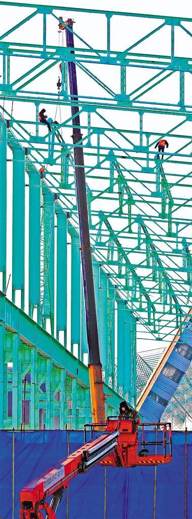 2月17日,內(nèi)蒙古興安盟敬業(yè)集團(tuán)烏蘭浩特鋼鐵有限公司雙高棒技改工程現(xiàn)場,建設(shè)者在安裝屋面檁條。鄭志宏攝(中經(jīng)視覺)