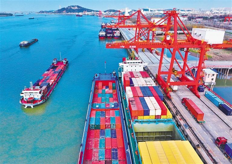 2月17日,安徽港口集團(tuán)蕪湖港朱家橋國際集裝箱碼頭作業(yè)現(xiàn)場一派繁忙。王玉實(shí)攝(中經(jīng)視覺)