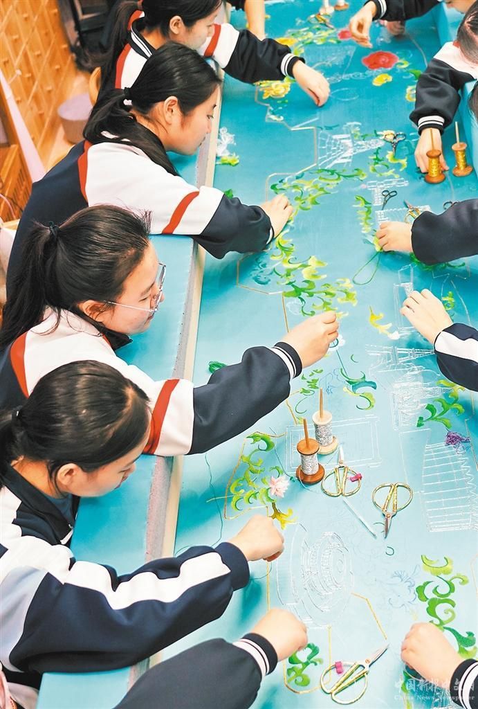北京市豐臺(tái)區(qū)職業(yè)教育中心學(xué)校,學(xué)生在繡制京繡長(zhǎng)卷作品。多年來,該校將非物質(zhì)文化遺產(chǎn)傳承與學(xué)校教育有效對(duì)接,產(chǎn)教融合。