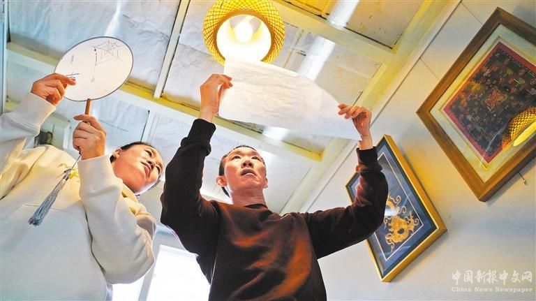 北京工美集團(tuán)有限公司工藝品廠,首席設(shè)計(jì)師席聞(左)和同事在交流京繡作品。北京補(bǔ)繡工藝是京繡擴(kuò)展項(xiàng)目,采用浮雕、編織、堆貼等多種工藝。