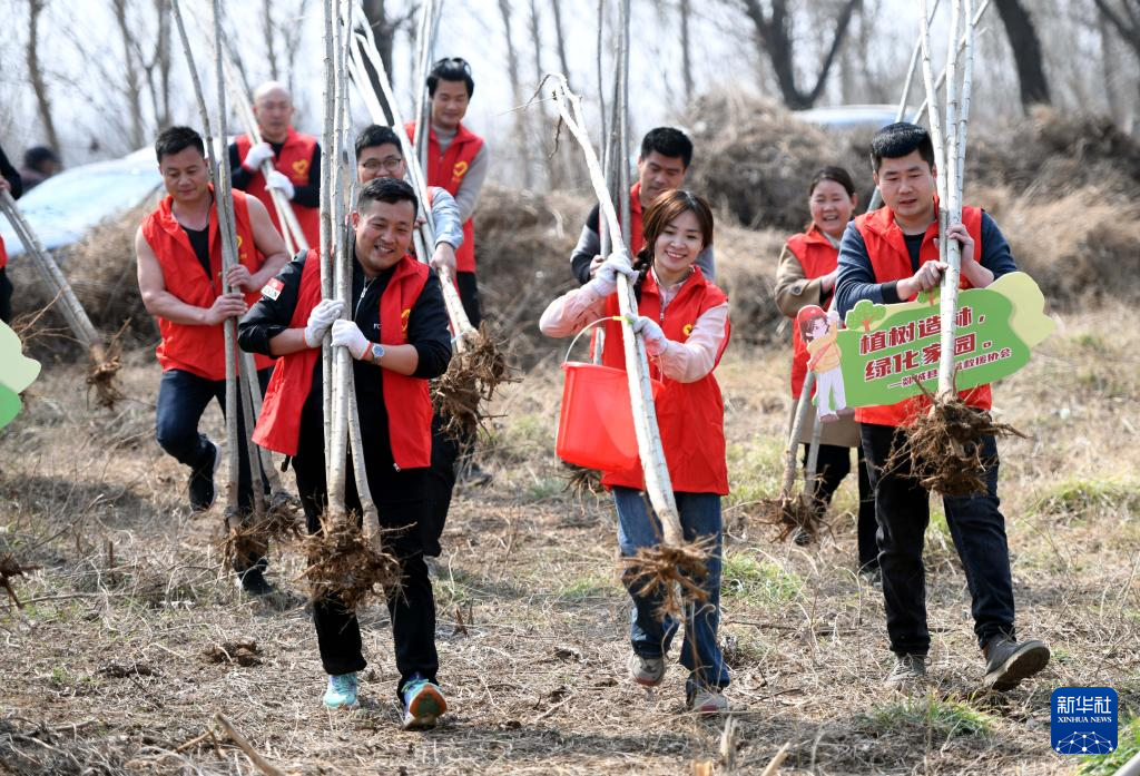 3月11日,山東省臨沂市郯城縣公益救援組織志愿者在馬頭鎮(zhèn)白馬河畔參加義務(wù)植樹(shù)活動(dòng)。