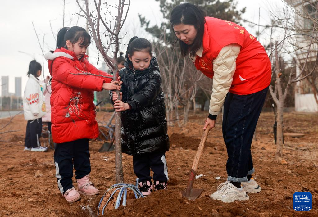 3月11日,江蘇省蘇州市姑蘇區(qū)新莊社區(qū)志愿者帶著小朋友一起參加義務(wù)植樹(shù)活動(dòng)。