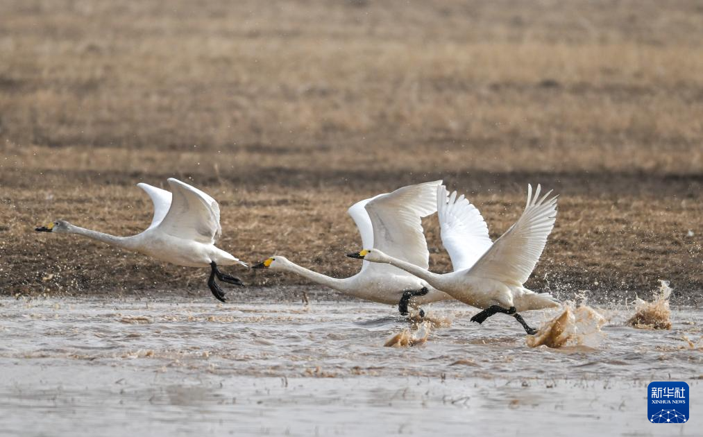 3月16日,在呼和浩特市托克托縣黃河濕地,天鵝在水面上準(zhǔn)備起飛。
