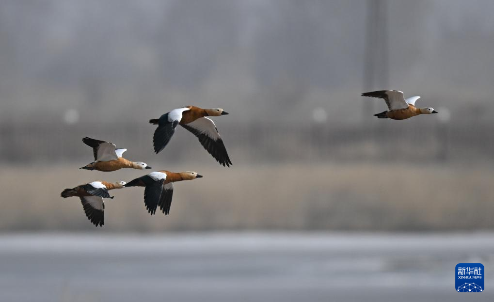 3月16日,在呼和浩特市托克托縣黃河濕地,赤麻鴨在空中飛翔。