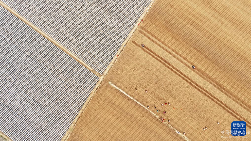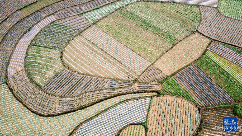 3月17日,廣西靖西市祿峒鎮(zhèn)農(nóng)貢村農(nóng)民在田間勞作(無(wú)人機(jī)照片)。