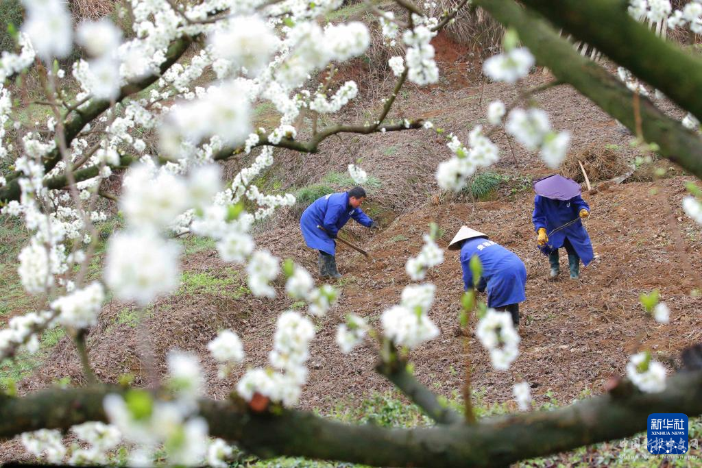 3月17日,在貴州省銅仁市玉屏侗族自治縣朱家場(chǎng)鎮(zhèn)混寨村,村民在李花間整地。