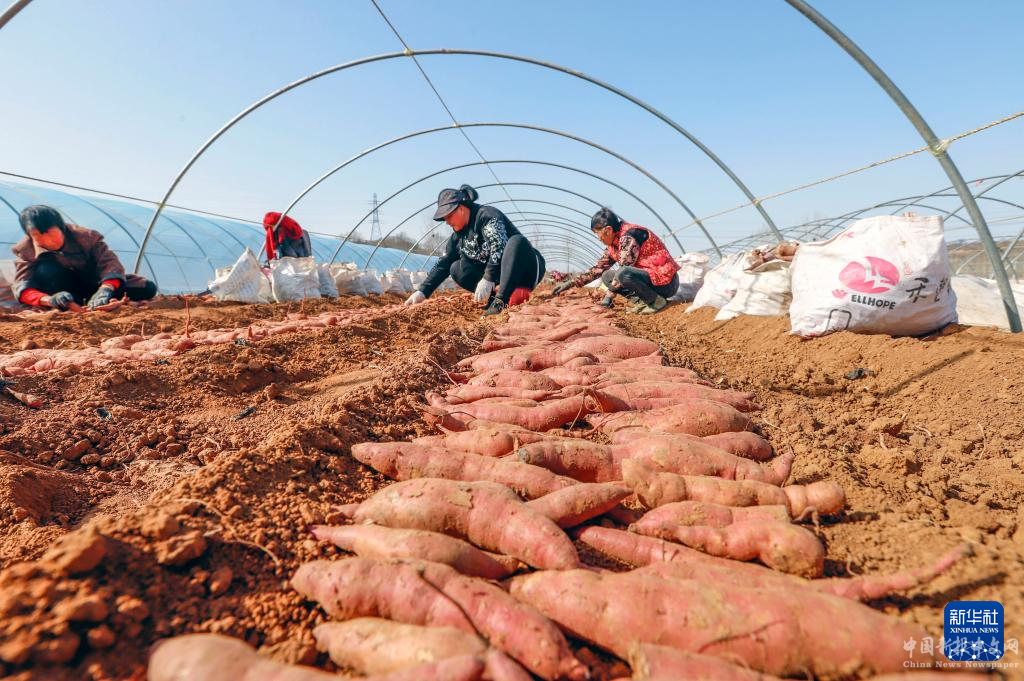 3月17日,河北省遵化市劉備寨鄉(xiāng)水峪村農(nóng)民在紅薯育秧暖棚擺放紅薯。