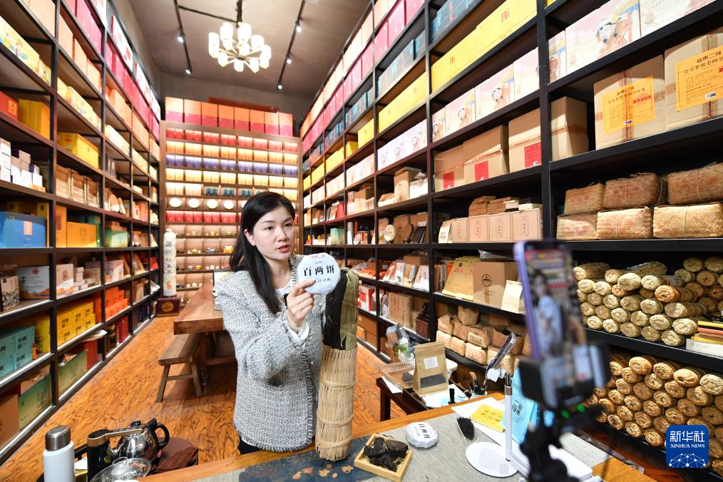3月26日,安化縣江南鎮(zhèn)一家茶企的工作人員在直播售茶。