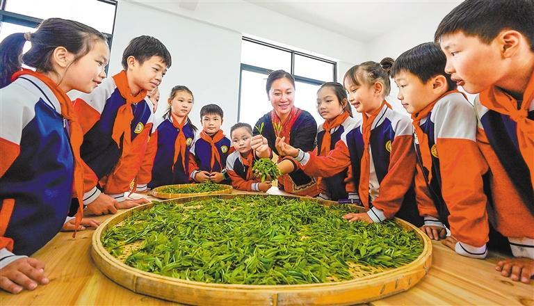 學(xué)生們?cè)趶V西金秀瑤族自治縣大樟鄉(xiāng)三古村茶產(chǎn)業(yè)研學(xué)基地學(xué)習(xí)茶葉制作技藝,體驗(yàn)中國(guó)傳統(tǒng)茶文化。