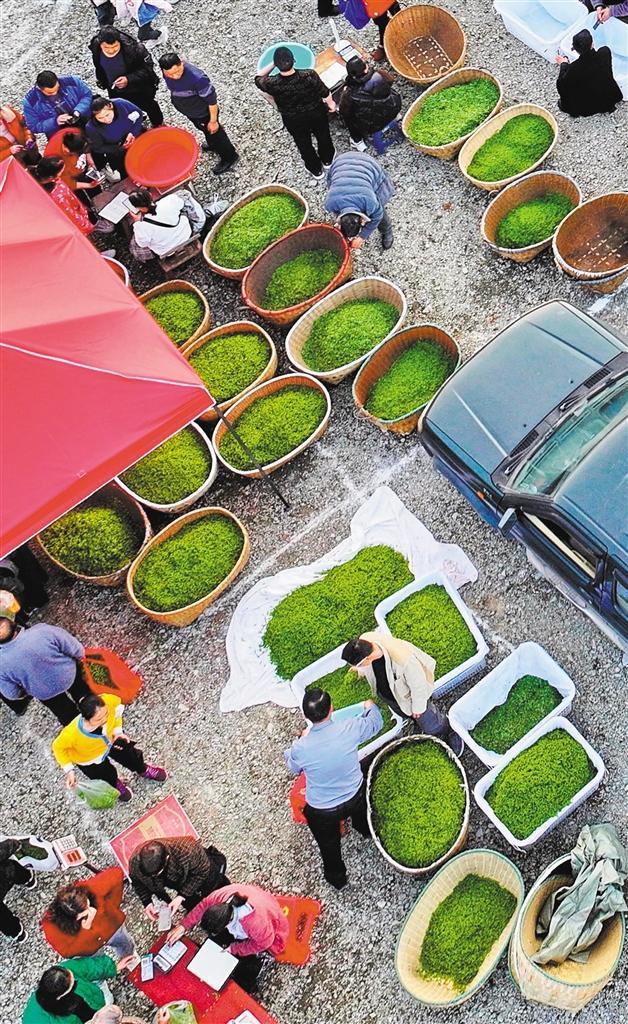 湖北恩施市芭蕉侗族鄉(xiāng)茶葉鮮葉交易市場(chǎng),茶商和茶農(nóng)在交易玉露明前茶。隨著第一批新茶上市,大批茶商前來(lái)恩施“尋寶”。張遠(yuǎn)明攝(中經(jīng)視覺(jué))