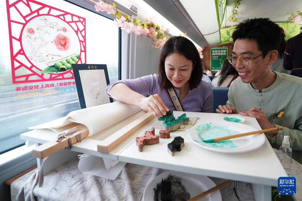 當(dāng)日,中國(guó)鐵路上海局集團(tuán)有限公司南京客運(yùn)段在G132次、G7393次等列車上開展“繽紛展演上高鐵”活動(dòng)?;顒?dòng)中,民間藝人分別進(jìn)行饾彩拱花、南京絨花、青團(tuán)制作等傳統(tǒng)手藝展演并邀請(qǐng)旅客互動(dòng)體驗(yàn),讓旅客在旅途中感受傳統(tǒng)文化的魅力。