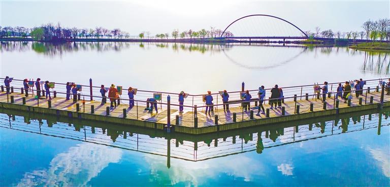 3月22日,江蘇省宿遷市湖濱新區(qū)駱馬湖羅曼園,學生在寫生,描繪春日美景?! ⌒旖z  ?。ㄖ薪?jīng)視覺)
