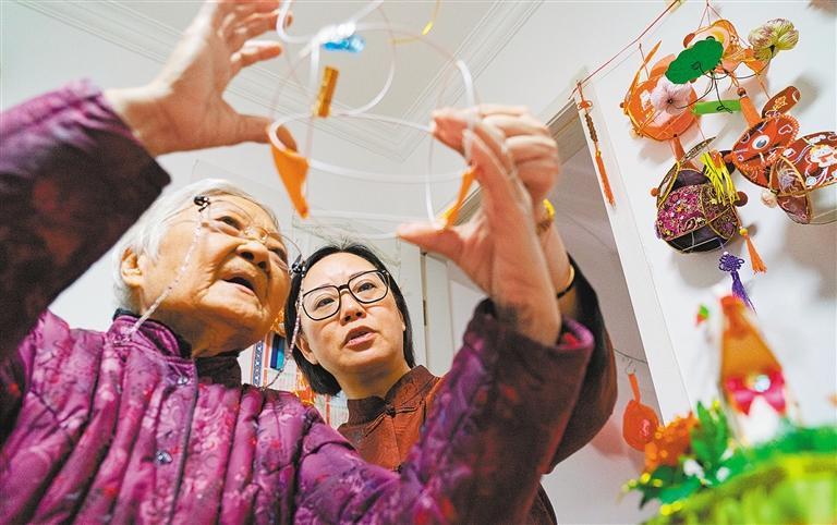 3月27日,上海市何氏燈彩傳承人何彩虹老人(左)和女兒韓鳳在家中交流探討燈彩骨架制作。立體動物燈彩是上海燈彩藝術最精粹的作品之一。