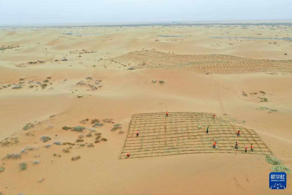 4月27日,治沙工人用稻草在沙漠中扎草方格(無(wú)人機(jī)照片)。