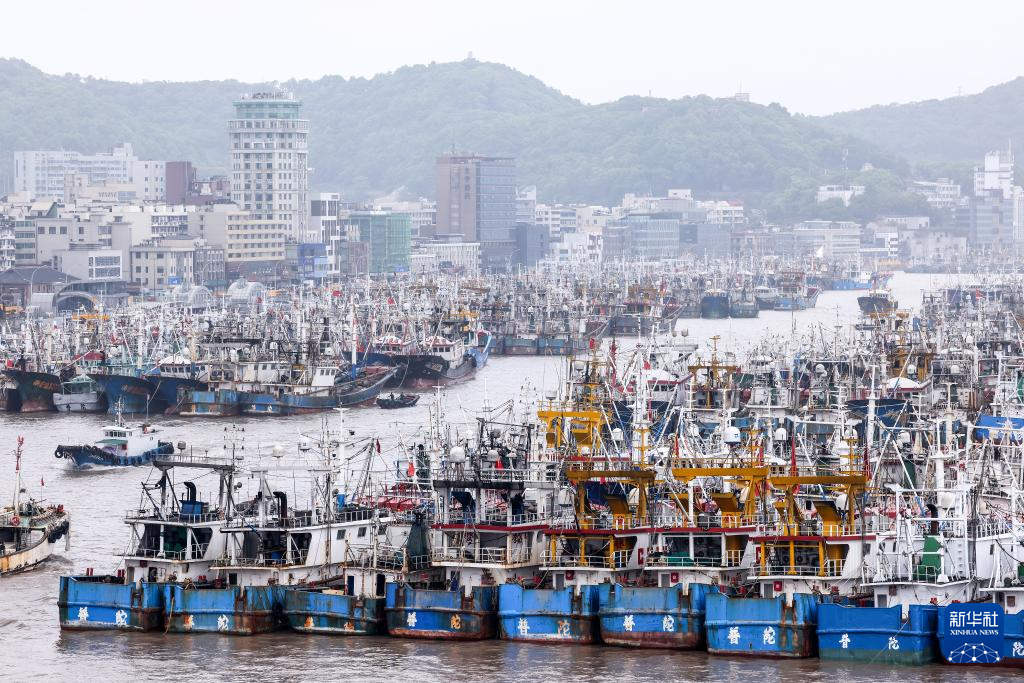 4月29日,浙江省舟山市普陀區(qū)沈家門漁港內(nèi)錨泊的漁船整齊排列,有漁船陸續(xù)進港。
