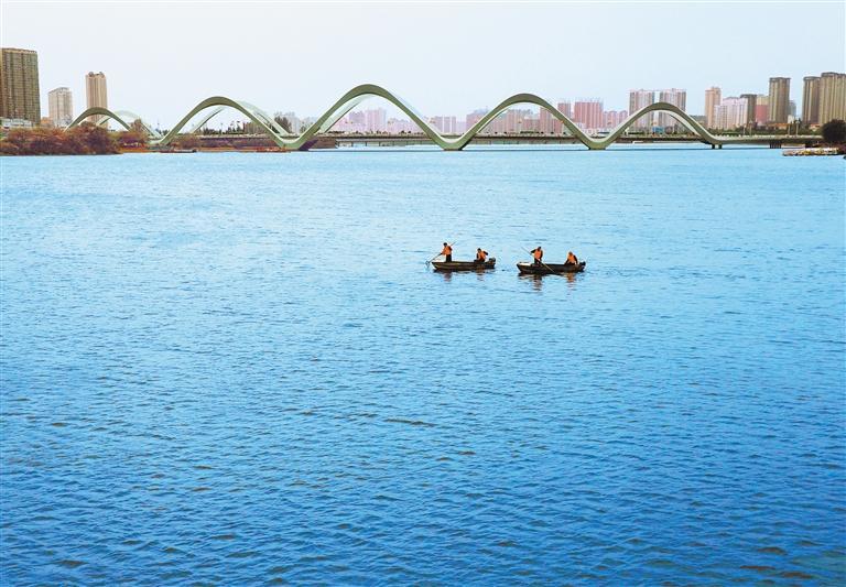 4月30日,河南省南陽市白河國家城市濕地公園,工人在打撈河面上的漂浮物。高 嵩攝(中經(jīng)視覺)