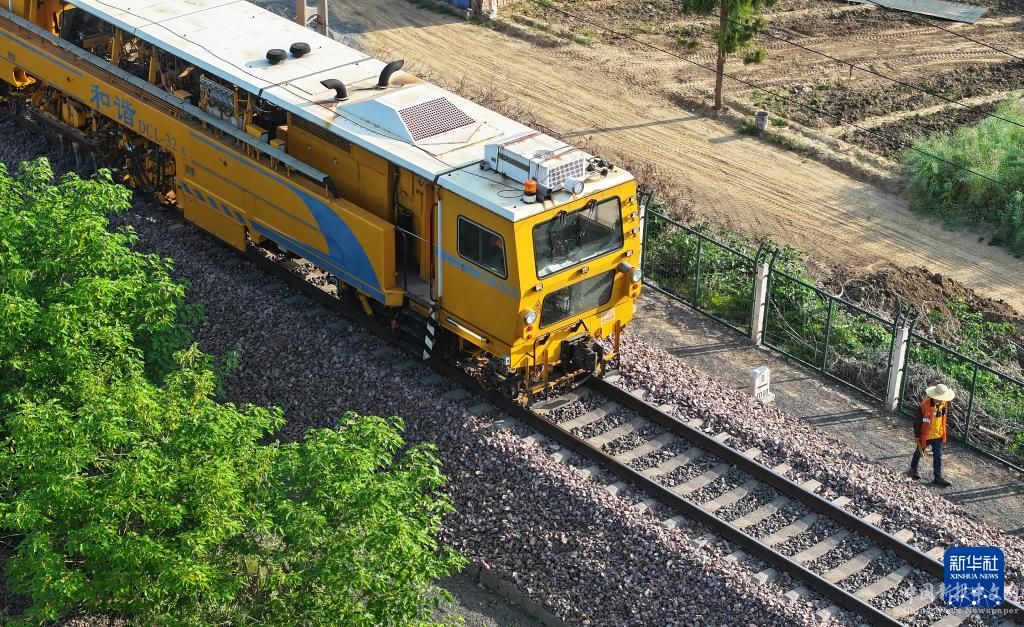 5月2日,國(guó)鐵集團(tuán)鄭州局鄭州工務(wù)機(jī)械段搗固車對(duì)線路進(jìn)行搗固作業(yè)(無(wú)人機(jī)照片)。