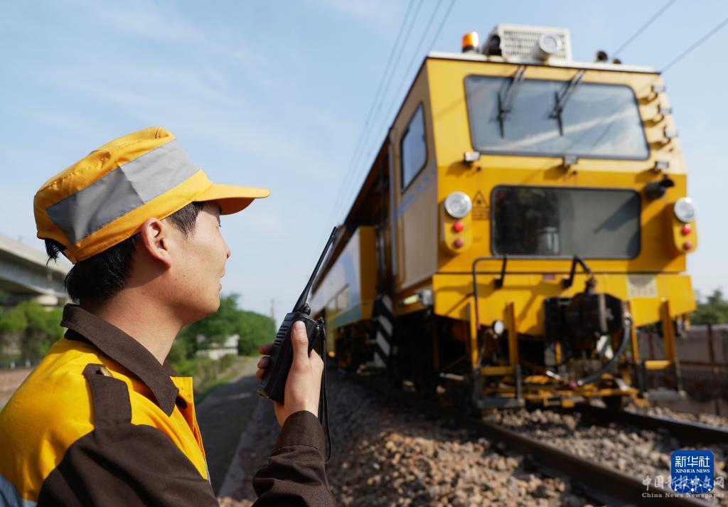5月2日,國(guó)鐵集團(tuán)鄭州局鄭州工務(wù)機(jī)械段作業(yè)人員指揮搗固車進(jìn)行搗固作業(yè)。