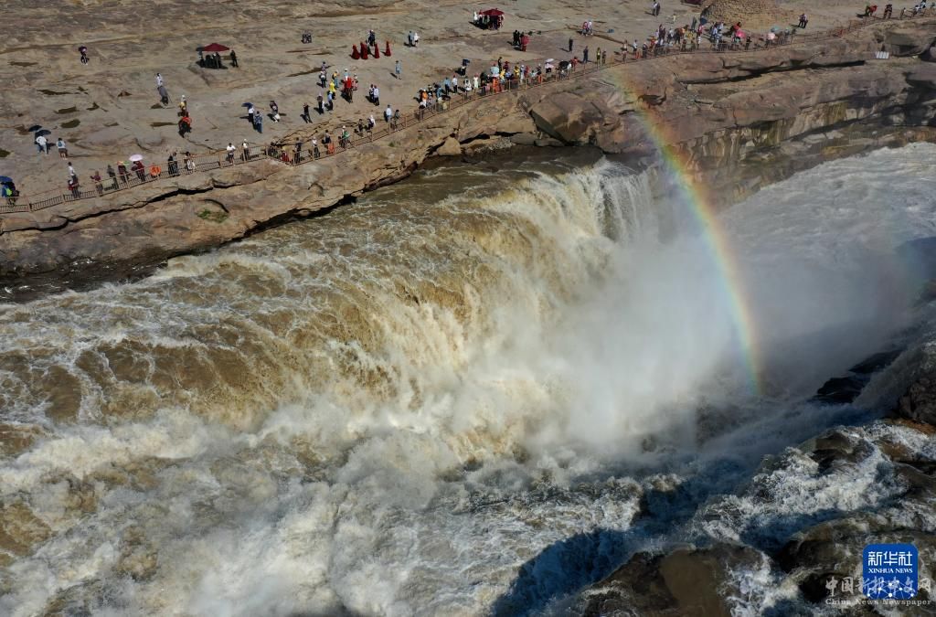 當(dāng)日,受降雨影響,黃河壺口瀑布水量增大,河水翻滾而下,飛濺起的水霧在陽光的照射下,形成“彩橋通天”景觀。