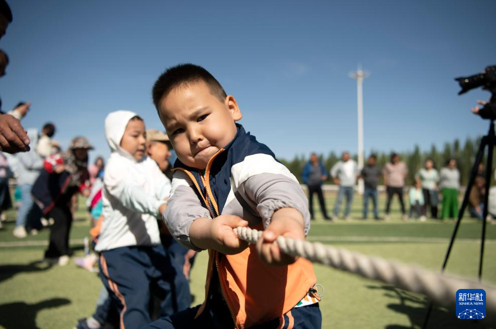 5月29日,在甘肅阿克塞哈薩克族自治縣賽馬場,小朋友們參加拔河比賽。
