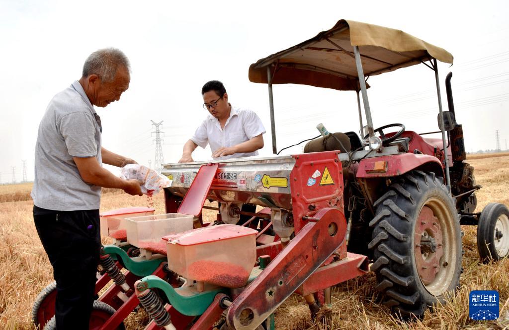 6月4日,在河北省邢臺(tái)市南和區(qū)左村,農(nóng)民向播種機(jī)添加玉米種子。