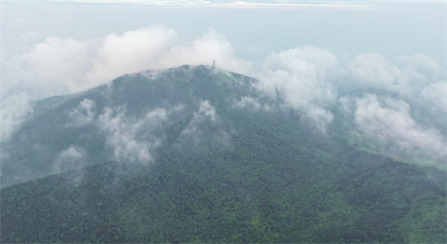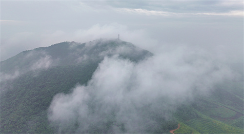 2024年6月20日清晨,在安徽省合肥市廬江縣冶父山國家級森林公園景區(qū),航拍鏡頭下,山岳峰嶺田園村舍一派云霧繚繞,如入仙境,冶父山主峰上雷公塔兀自獨(dú)立,形成一個(gè)標(biāo)志性景觀。仲夏雨后云霧冶父山,呈現(xiàn)出一派特別的大自然的迷人勝景。 (巢志斌 攝)