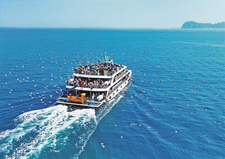 7月10日,山東榮成市海驢島景區(qū)迎來觀鷗旅游熱潮,游客乘游艇觀海鷗、賞海景。當?shù)亻_通環(huán)島游專線,讓游客感受海風清涼。