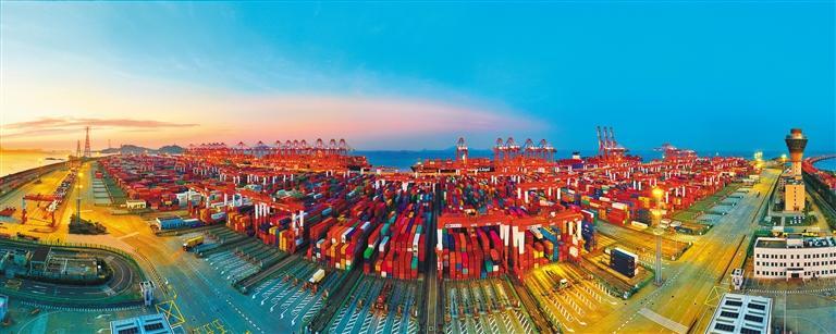 7月7日,上海洋山深水港區(qū)自動化碼頭,多艘超大型集裝箱貨輪正在進行裝卸作業(yè)。今年上半年,該港完成集裝箱吞吐量超2500萬標箱。