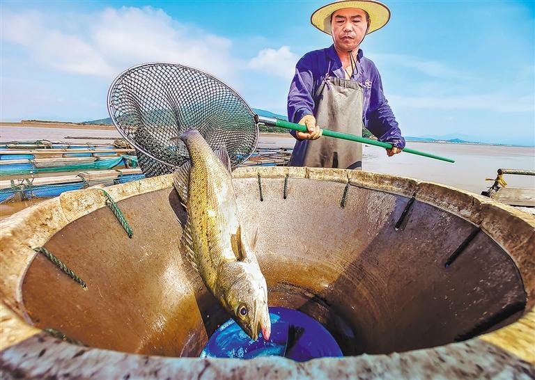 7月11日,浙江溫嶺市塢根鎮(zhèn)鱸魚養(yǎng)殖戶在收獲鱸魚。該鎮(zhèn)主要養(yǎng)殖鱸魚、紫菜、海帶、牡蠣等水產品,養(yǎng)殖面積18800畝,年銷售額超1億元。