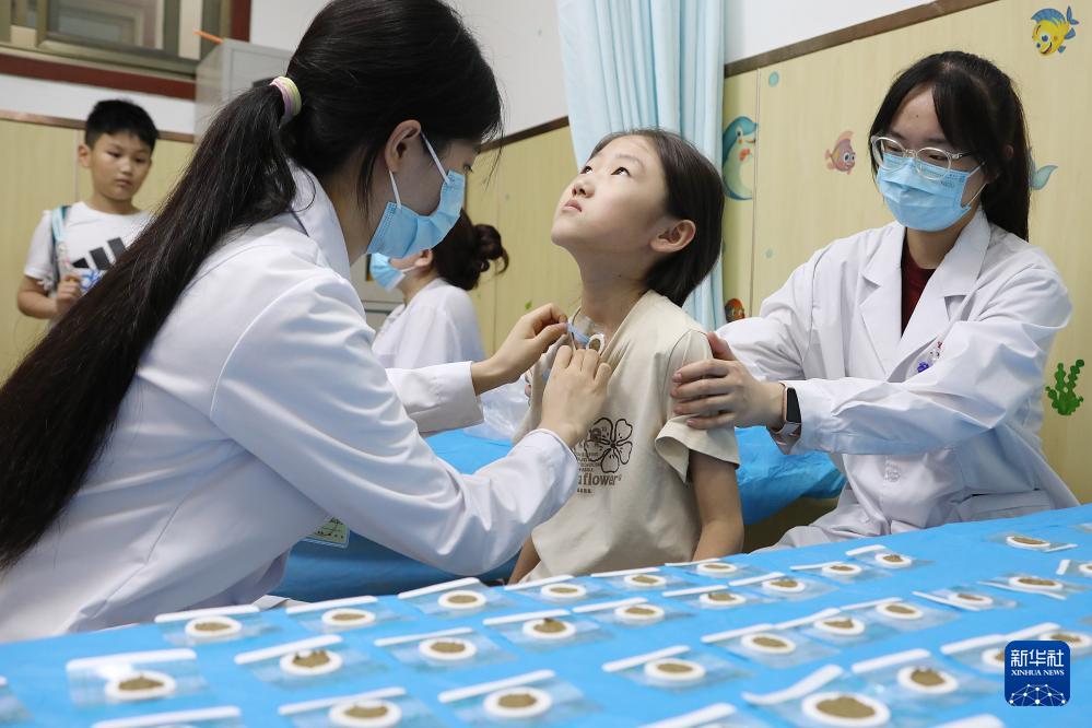7月15日,在江蘇省南通市中醫(yī)院,醫(yī)務人員為小朋友貼“三伏貼”。