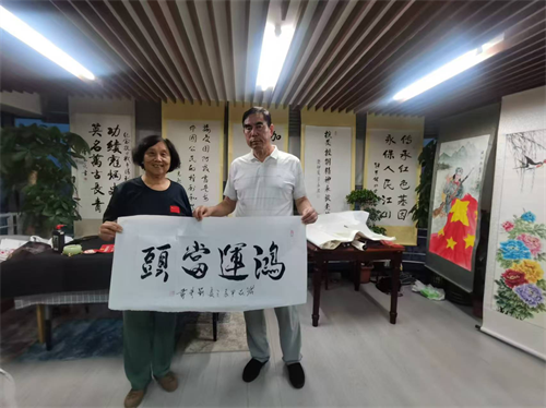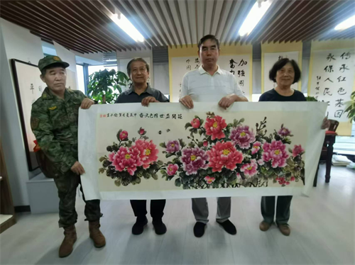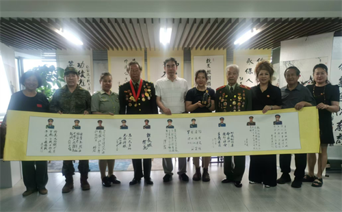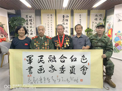慶祝中國人民解放軍建軍97周年書畫筆會(展)在嘹亮的中國人民解放軍軍歌《義勇軍進行曲》拉開了序幕。91歲高齡的抗美援朝戰(zhàn)斗英雄李采講述了1952年入伍(16歲)參加抗美援朝、1960年參加西藏平叛剿匪、1962年參加對印作戰(zhàn)等戰(zhàn)斗故事,同時李采館長得到黃胄老師,老紅軍首長王德清指導,從沙盤走入山水畫仙境,并寫生創(chuàng)意高原景觀,是中國中外名人文化研究會理事、著名詩書畫學者,尤長于山水畫研究。被戰(zhàn)友們稱為“拓荒牛”的“張思德傳人”——孔祥秀,他以英模的身份先后25次受到毛主席接見,他作為警衛(wèi)標兵、軍隊學習毛主席著作積極分子的典范,多次與毛主席親切握手并合影留念。天安門城樓上國慶觀禮他就站在毛主席身邊,當毛主席聽到天安門廣場上群眾高呼“毛主席萬歲”,毛主席左手抓住欄桿,右手向前舉起高呼“人民萬歲”!1968年1月19日,毛主席和周恩來、聶榮臻、徐向前、葉劍英等黨和軍隊領導人接見北京衛(wèi)戍區(qū)和中央警衛(wèi)團英模人物,首都警衛(wèi)戰(zhàn)士共300余人參加接見??紫樾阕鳛橹飨瘓F成員,在前排右側座位上就座??紫樾愦丝桃呀?jīng)肩負起抗美援越中的戰(zhàn)斗任務,忍不住向毛主席說出了自己的心里話:“毛主席呀,我們明天就要去抗美援越了,我一定要把所有戰(zhàn)士都安全地給您帶回來。”主席微笑著使勁地再握一下孔祥秀的手,高興地說:“好!好!好!”??紫樾阚`行書寫“人民萬歲”、“為人民服務”67年。著名書畫家北京百年風云文化藝術中心軍民融合紅色書畫家委員會北京、臺創(chuàng)園主席賀衛(wèi)平、劉青即興創(chuàng)作并捐贈30余幅慶祝中國人民解放軍建軍97周年及雙擁書畫。書畫筆會(展)在《中國人民志愿軍戰(zhàn)歌》中告一段落。
