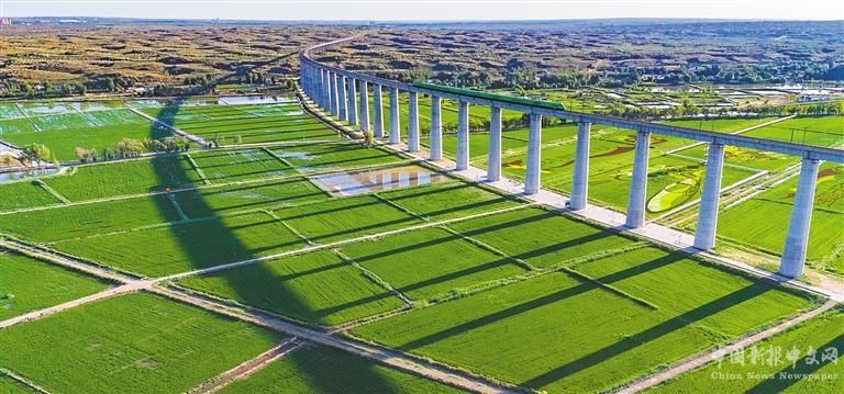 7月17日,高鐵列車駛過準格爾旗小灘子村黃河稻漁生態(tài)觀光園。當(dāng)?shù)赝ㄟ^稻蟹魚共生的原生態(tài)種養(yǎng)模式,讓曾經(jīng)撂荒多年的重度鹽堿地成為美麗的七彩稻田。
