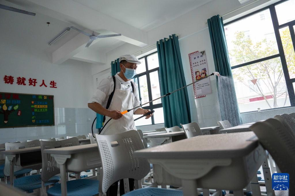 8月29日,在平江縣啟明中學,學校職工在教室進行消殺防疫作業(yè)。