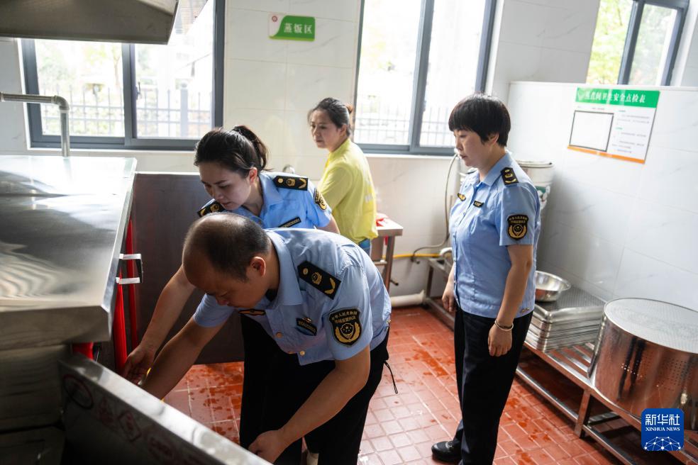 8月29日,在平江縣啟明中學,市場監(jiān)督管理局工作人員對重裝過的食堂進行食品衛(wèi)生安全檢查。
